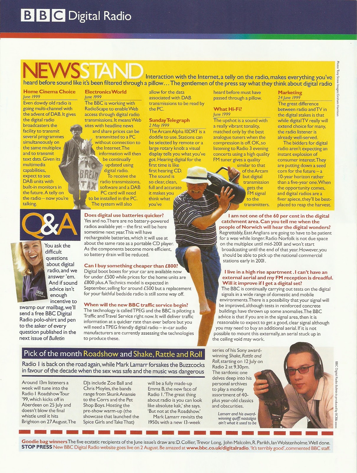 In the third bulletin from November 1999 there’s news of a joint BBC/Digital One marketing campaign. Glyn Jones, the BBC’s project director, said: “Both Digital One and the BBC recognise that this is a time for co-operation to help deliver the substantial benefits of digital radio to UK consumers. Working together on a range of marketing initiatives will help each of us attract more attention and have greater impact.” There’s also news on Radio 5 Live Sports Plus and that Mark Byford, chief executive of the World Service, had his digital car radio stolen.